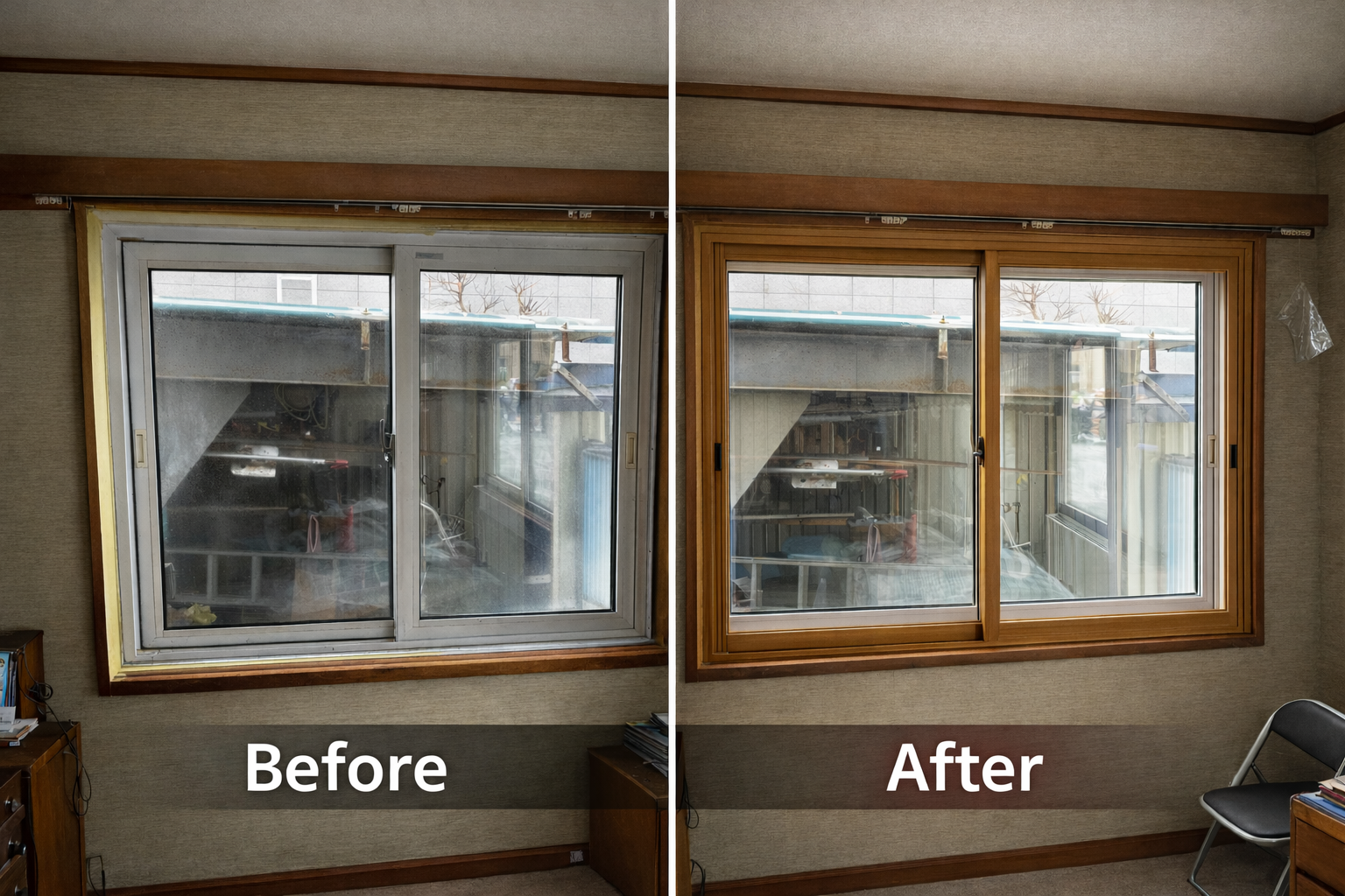 施工前は、窓からの冷気や結露の影響で、室内の寒さや不快感が気になる状態でした。しかし、内窓を設置することで外気の影響をしっかり遮断し、室内の温度が安定し、快適で過ごしやすい空間へと改善されました。また、見た目もスッキリとした印象になり、断熱性能だけでなく住まい全体の快適性が大きく向上しています。「もっと早くやればよかった」というお声を多くいただいています。